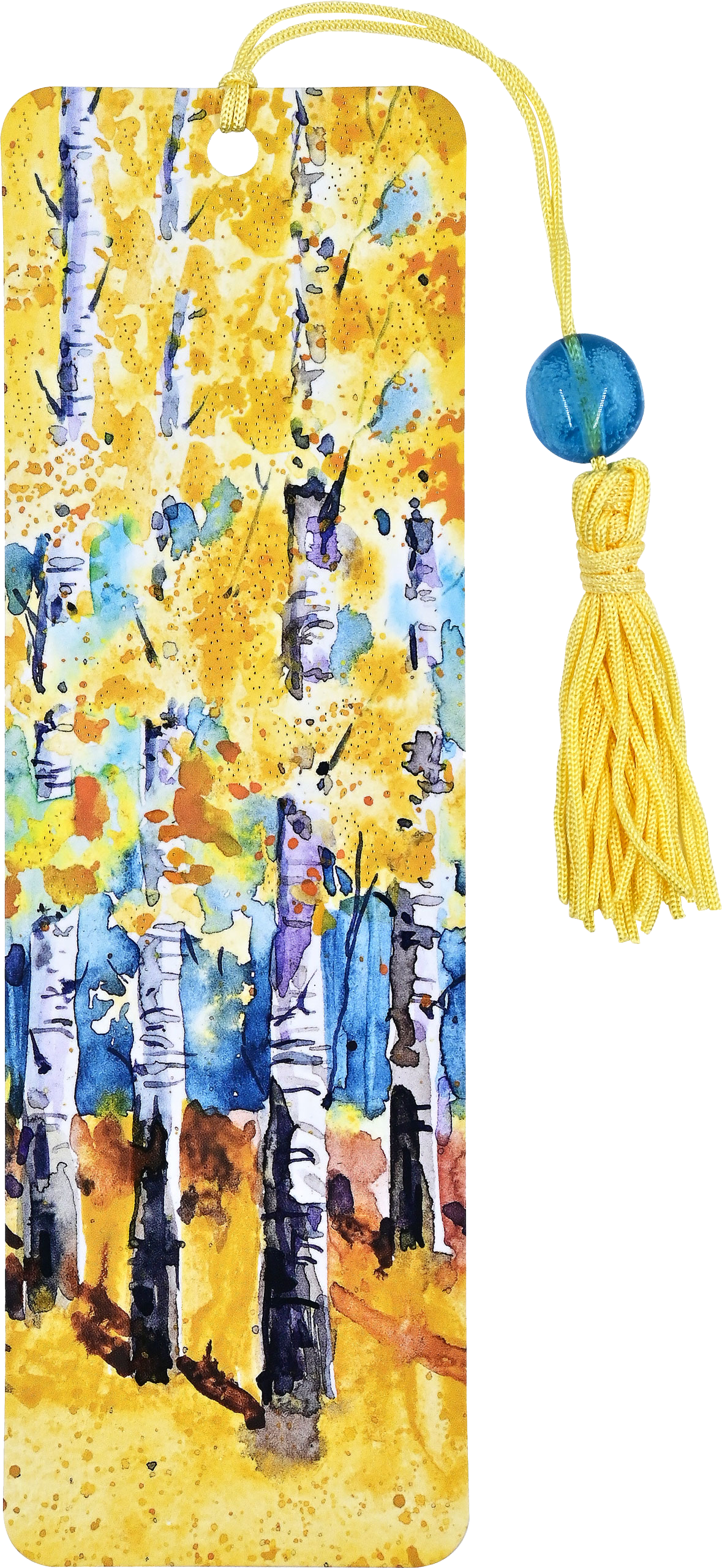 White aspen trees with golden leaves grace this appealing beaded bookmark. Attached: A silky matching tassel with a beautiful blue accent bead. A bonus on the back: A handy printed ruler in inches and centimeters. Bookmark is printed on sturdy, smooth-finish card stock. Design is embellished with gloss highlights. Bookmark measures 2-1/2'' wide x 7-1/8'' high. Bookmark is encased in a protective transparent plastic sleeve. Warning: Choking hazard, small parts. Not for children under 3 years.