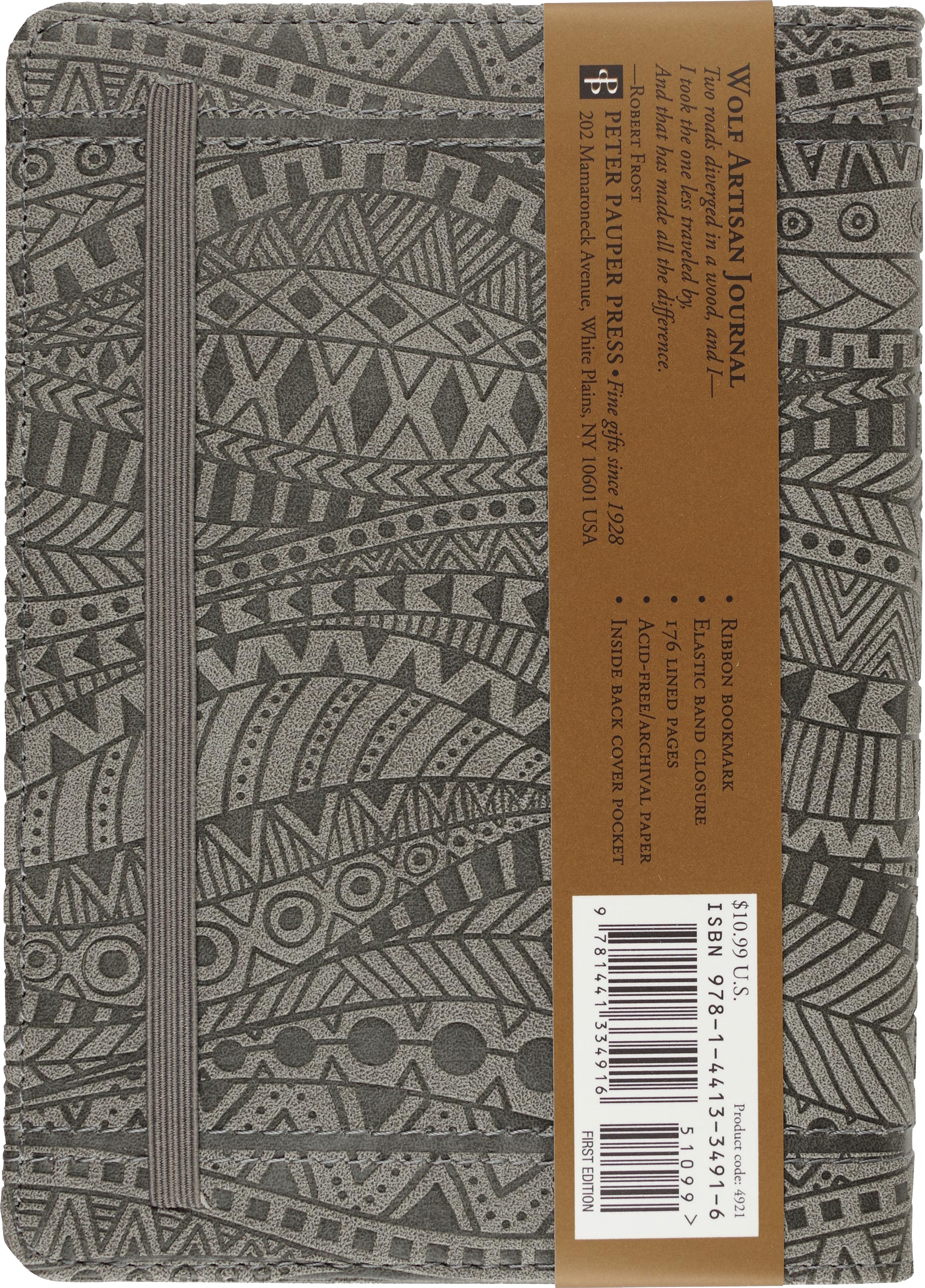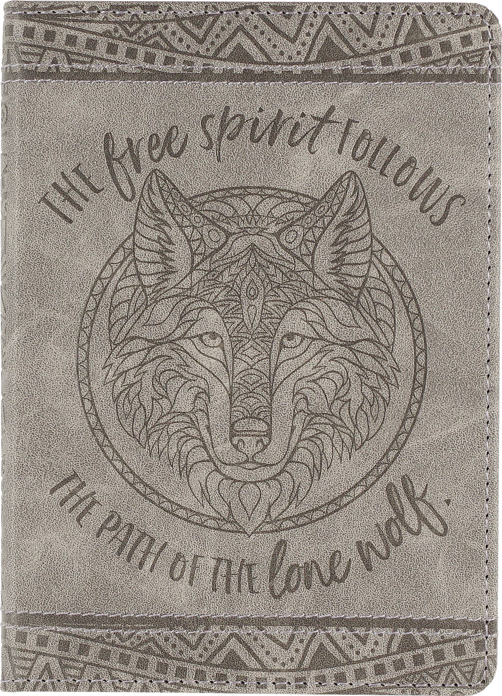 Write fiercely within the pages of this beautiful journal, featuring decorative stitching, soft, leather-like cover material, the image of a wolf, and the iconic phrase, ''The free spirit follows the path of the lone wolf.'' Crisp writing pages are perfect for personal reflections, sketching, or for recording favorite quotations or poems. Premium 120 gsm paper takes pen or pencil beautifully. Paper is acid free and of archival quality. Light gray lines subtly guide your writing. A ribbon bookmark keeps your place. The inside back cover pocket expands to hold notes, cards, mementos, and more. A matching elastic closure secures your journal. Cover embossing adds texture and dimension. Complementary interior endpapers. Sturdy bookbound vegan leather journal. Rounded cover corners for reduced wear. Journal meas