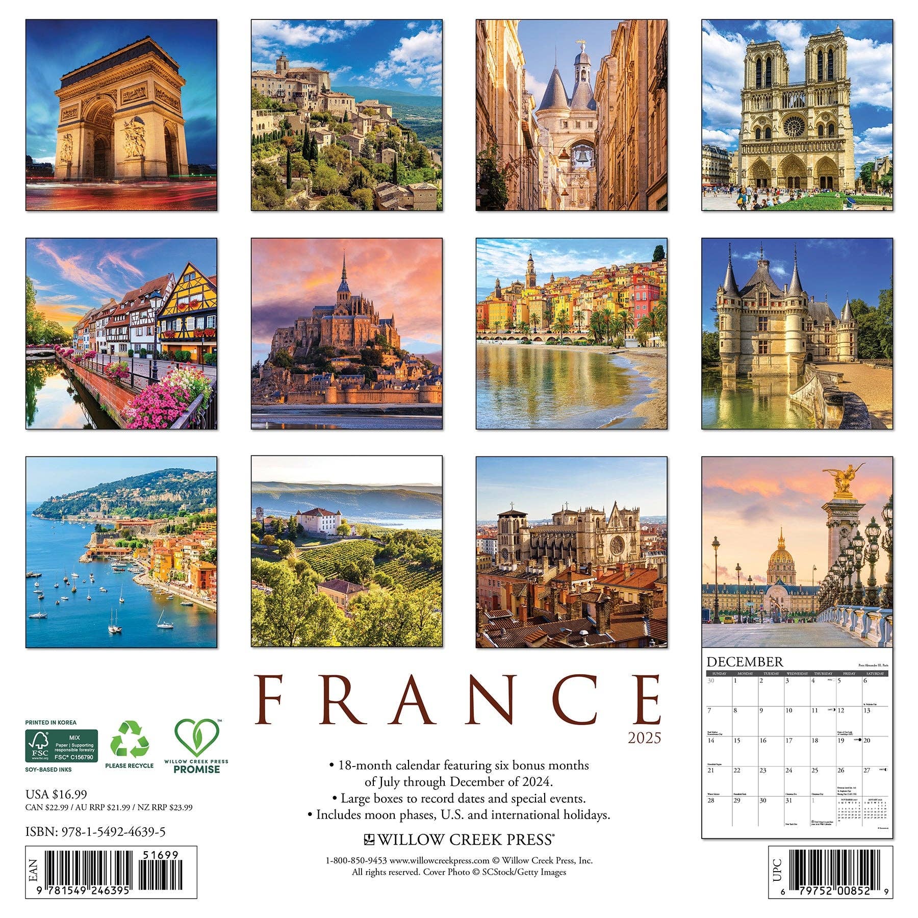 The splendors of l’Hexagone are on full display with the 2025 France 12" x 12" Wall Calendar. Each month unveils a captivating glimpse of this romantically beautiful country, inviting you to savor the loveliness of its cities, the charm of the countryside, and rich culture of the arts, cuisine, and architecture. Whether you're a Francophile dreaming of your next visit or appreciate the allure of the French, this calendar is a celebration of la joie de vivre.
